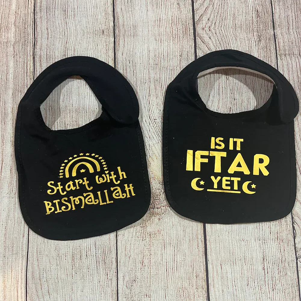 A stylish bib in luxurious black, decorated with the phrase "Start with Bismillah" or "Breakfast" in an attractive Arabic script with shiny gold lettering.