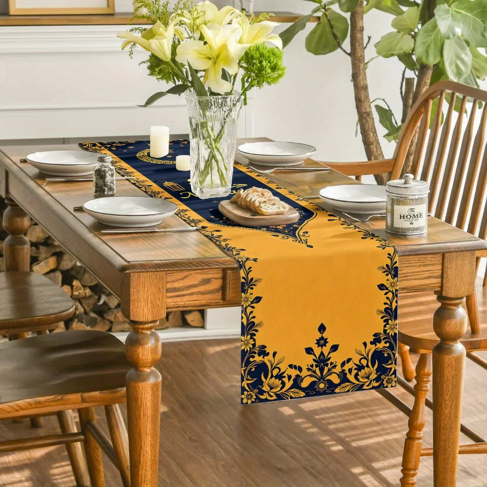Celebrate Eid al-Fitr and the blessed month of Ramadan with this exquisite, custom-designed table runner. Crafted from luxurious 100% pure Linen using traditional Woven techniques and delicate Tatting details, it offers superior quality and texture. The stunning Printed Pattern features the beautiful Crescent Moon and Floral motifs, instantly transforming your dining room into a festive banquet space. Durable, stylish, and perfect for creating a memorable holiday atmosphere at Home or for special events.