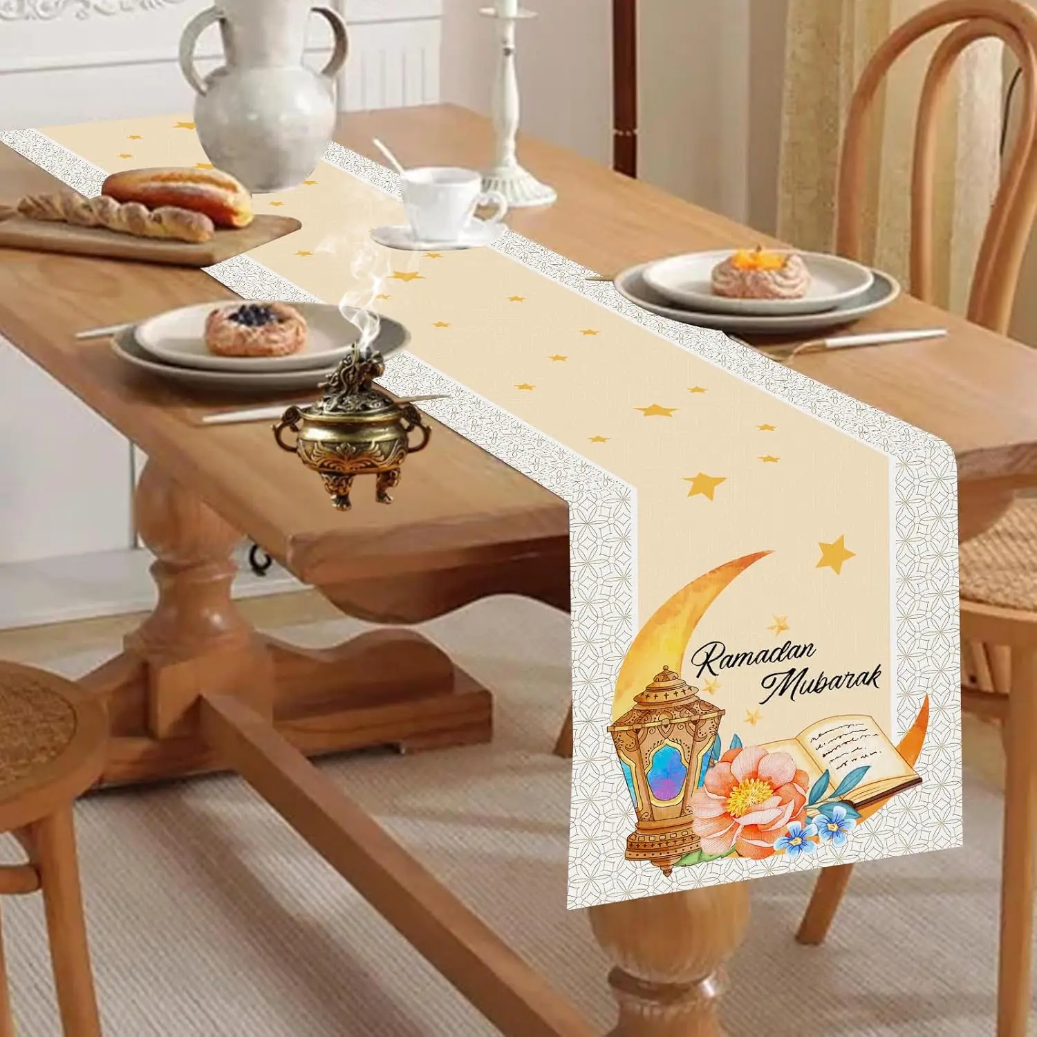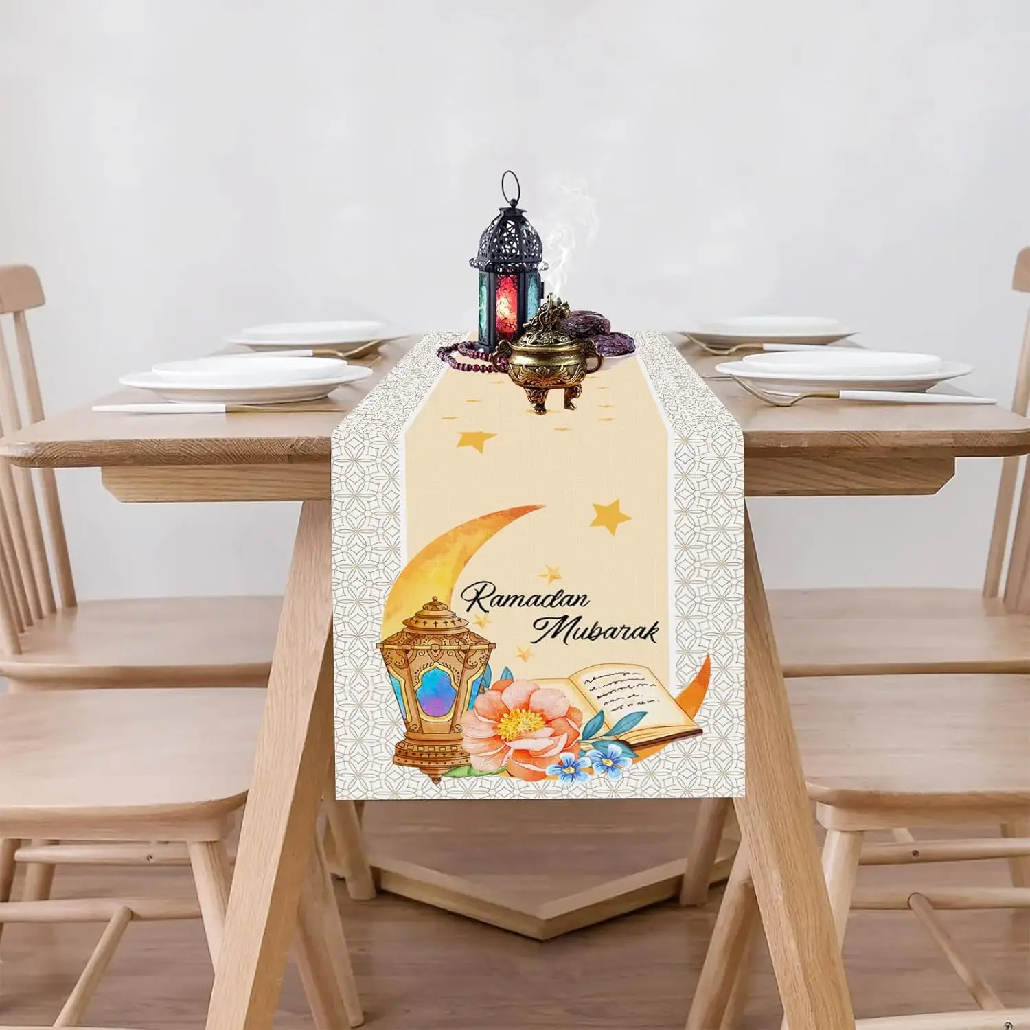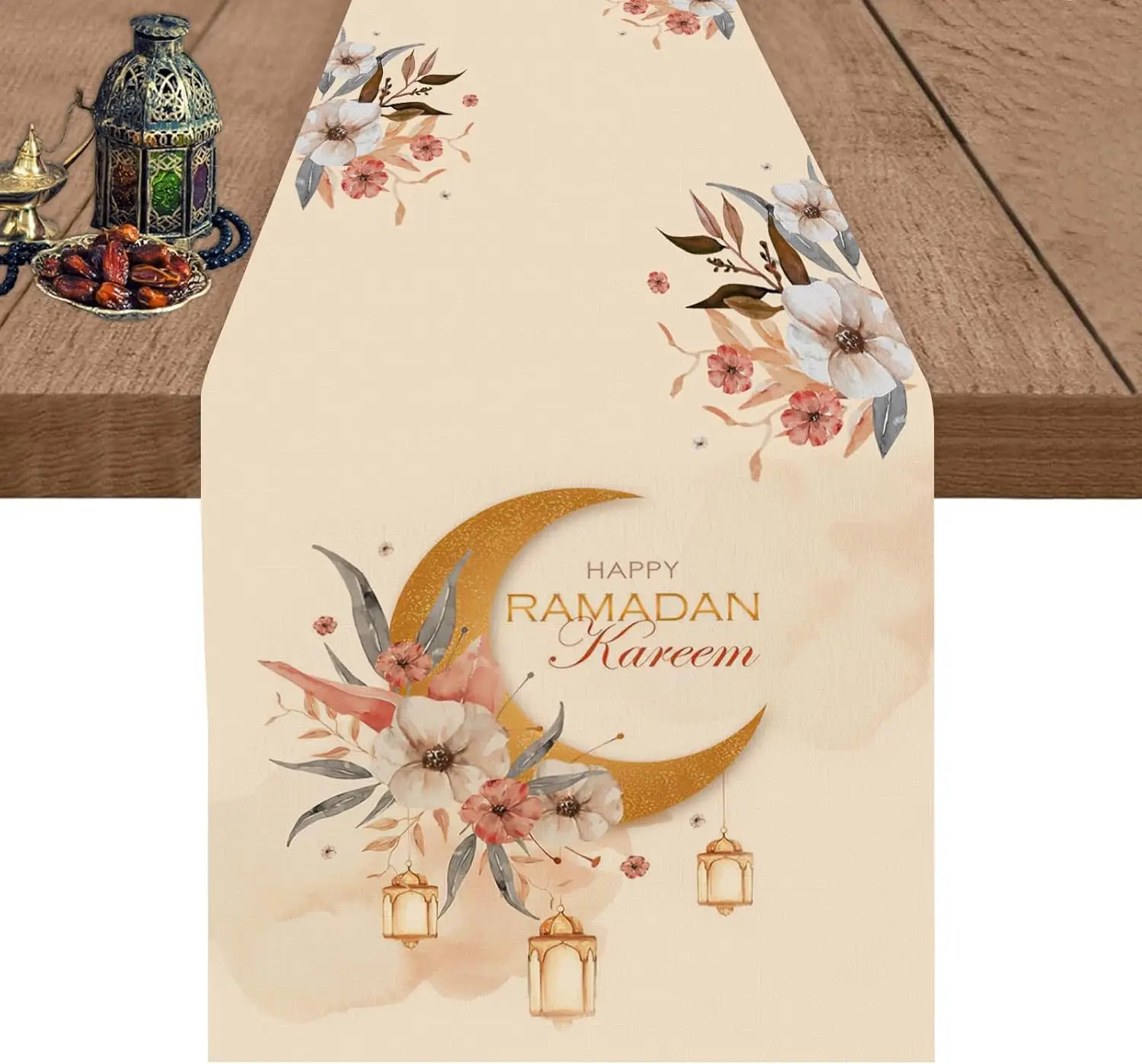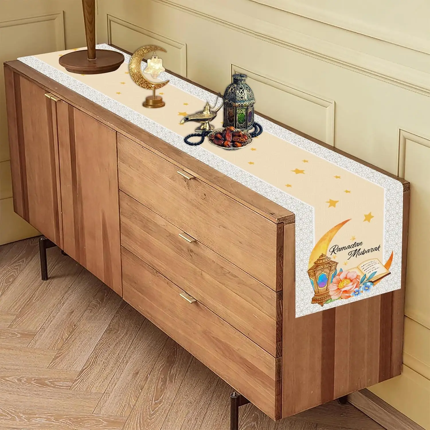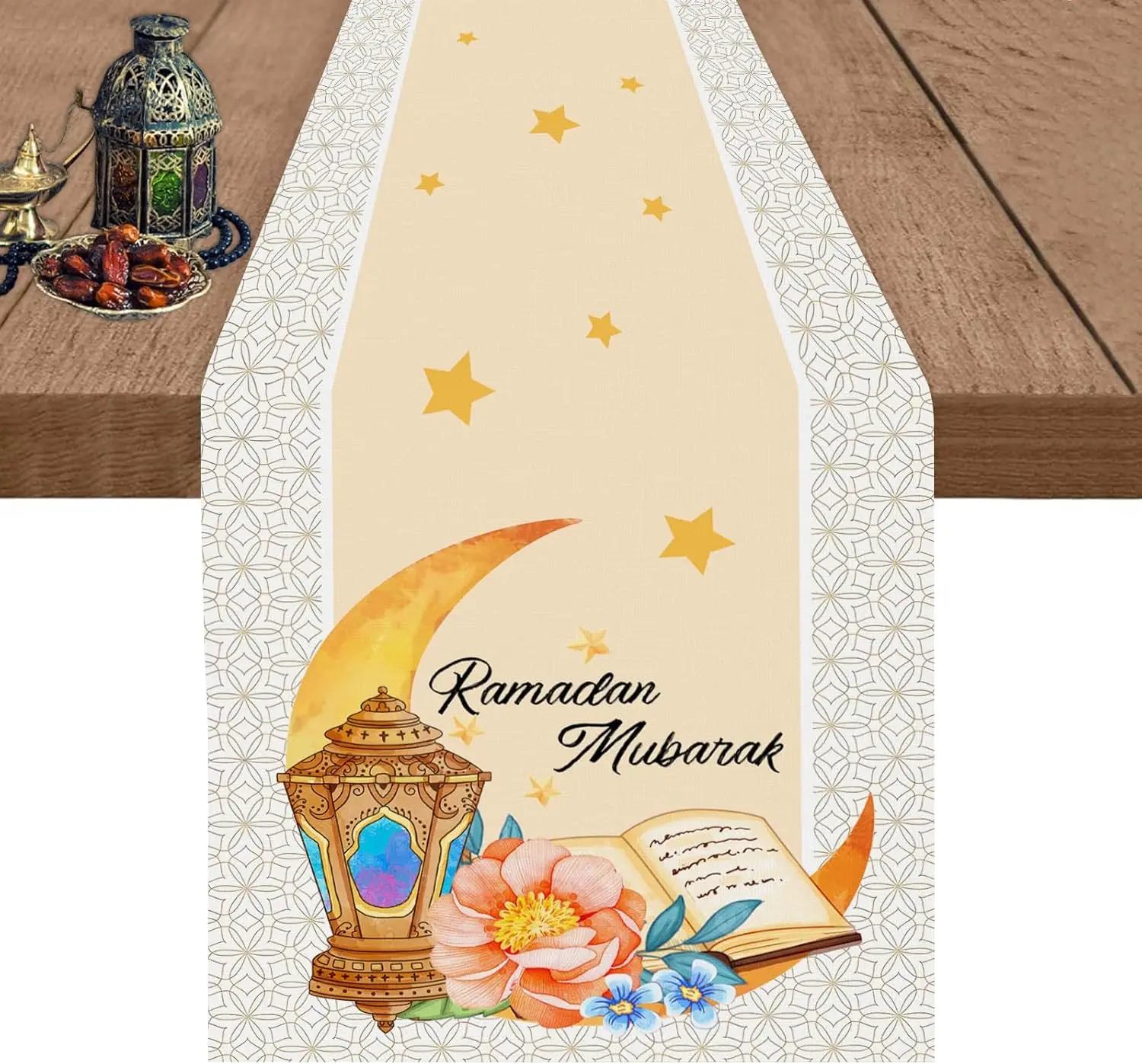 Transform your holiday dining table into a lavish banquet with this stunning, custom-designed table runner. Crafted from premium 100% pure Linen using high-quality Woven techniques and delicate Tatting details, it provides an exquisite texture and drape. The striking Black and Golden design features Mosque, Star, and Moon motifs in an elegant Geometric Pattern, making it the perfect focal point for Ramadan gatherings, Eid Mubarak celebrations, or sophisticated Home décor throughout the year.