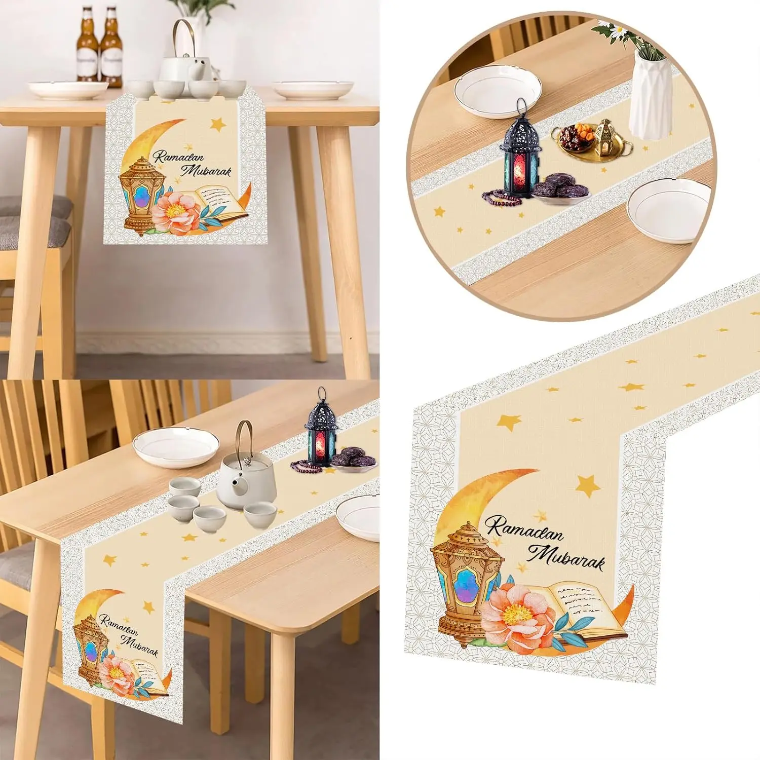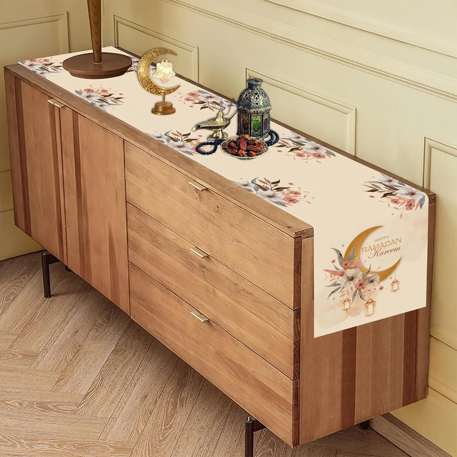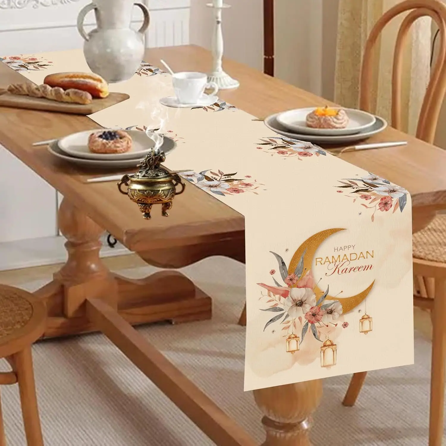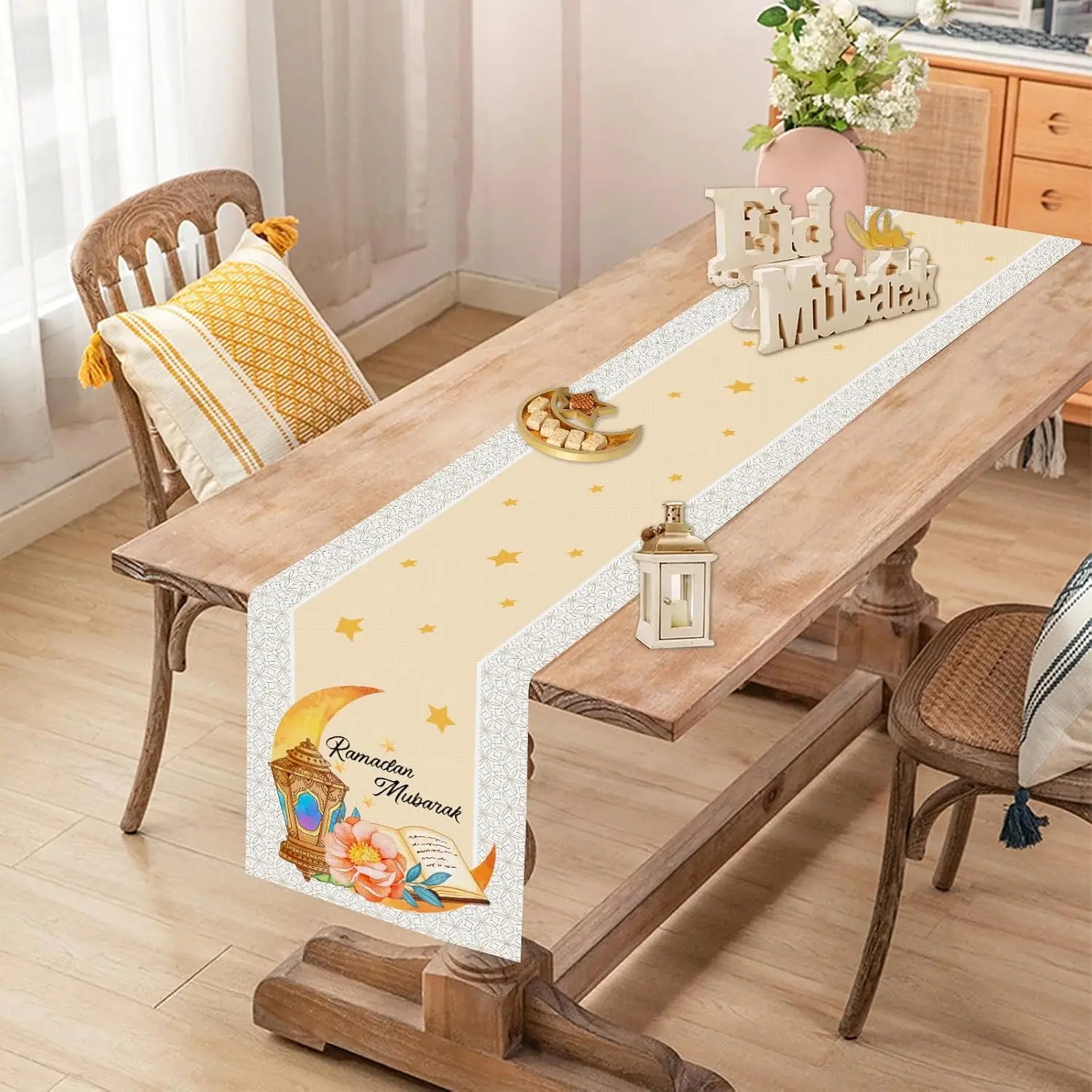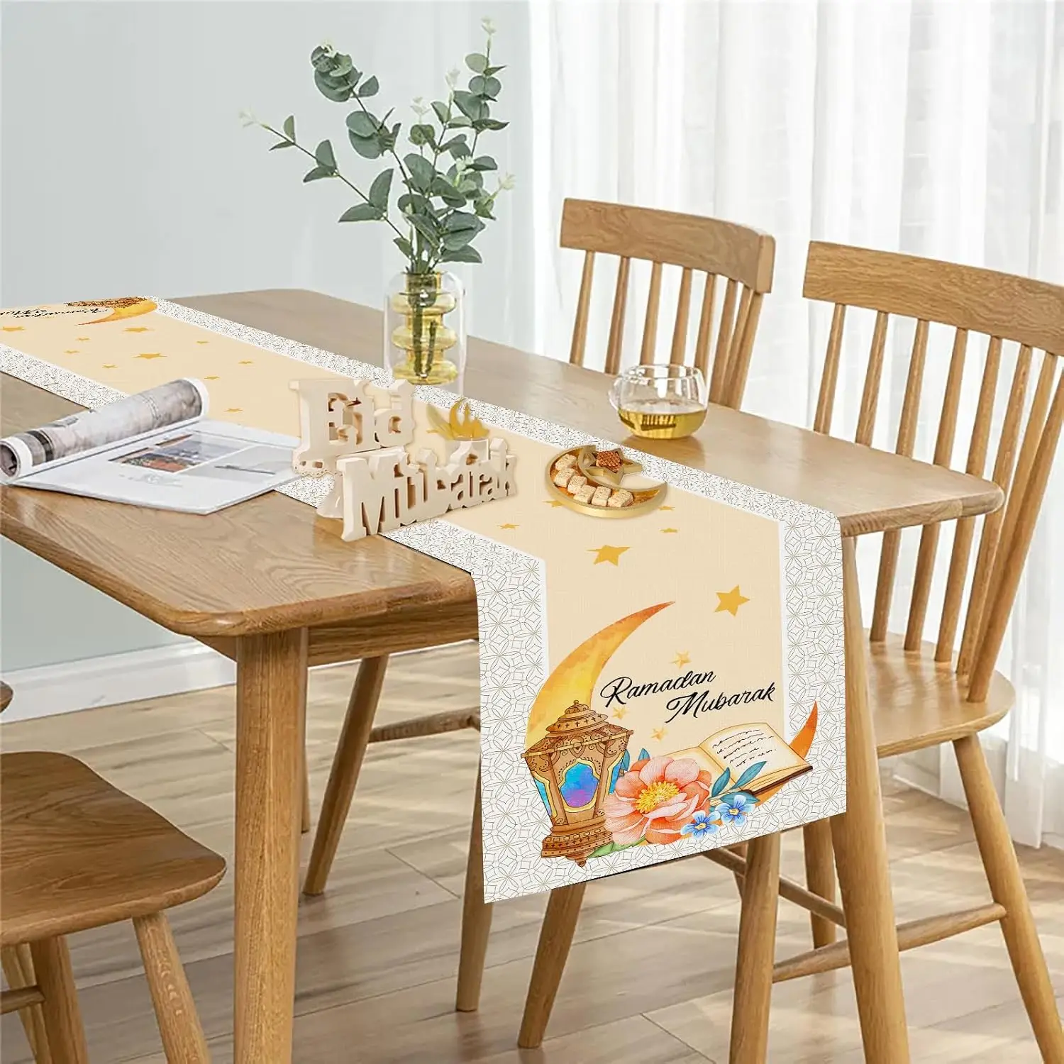 Transform your holiday dining table into a lavish banquet with this stunning, custom-designed table runner. Crafted from premium 100% pure Linen using high-quality Woven techniques and delicate Tatting details, it provides an exquisite texture and drape. The striking Black and Golden design features Mosque, Star, and Moon motifs in an elegant Geometric Pattern, making it the perfect focal point for Ramadan gatherings, Eid Mubarak celebrations, or sophisticated Home décor throughout the year.